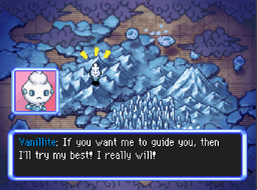 Vanillite is an aspiring mountain guide who hopes to help Pokémon climb to the top of Vast Ice Mountain! Although business isn’t doing so hot, that might change when an unexpected traveler arrives!